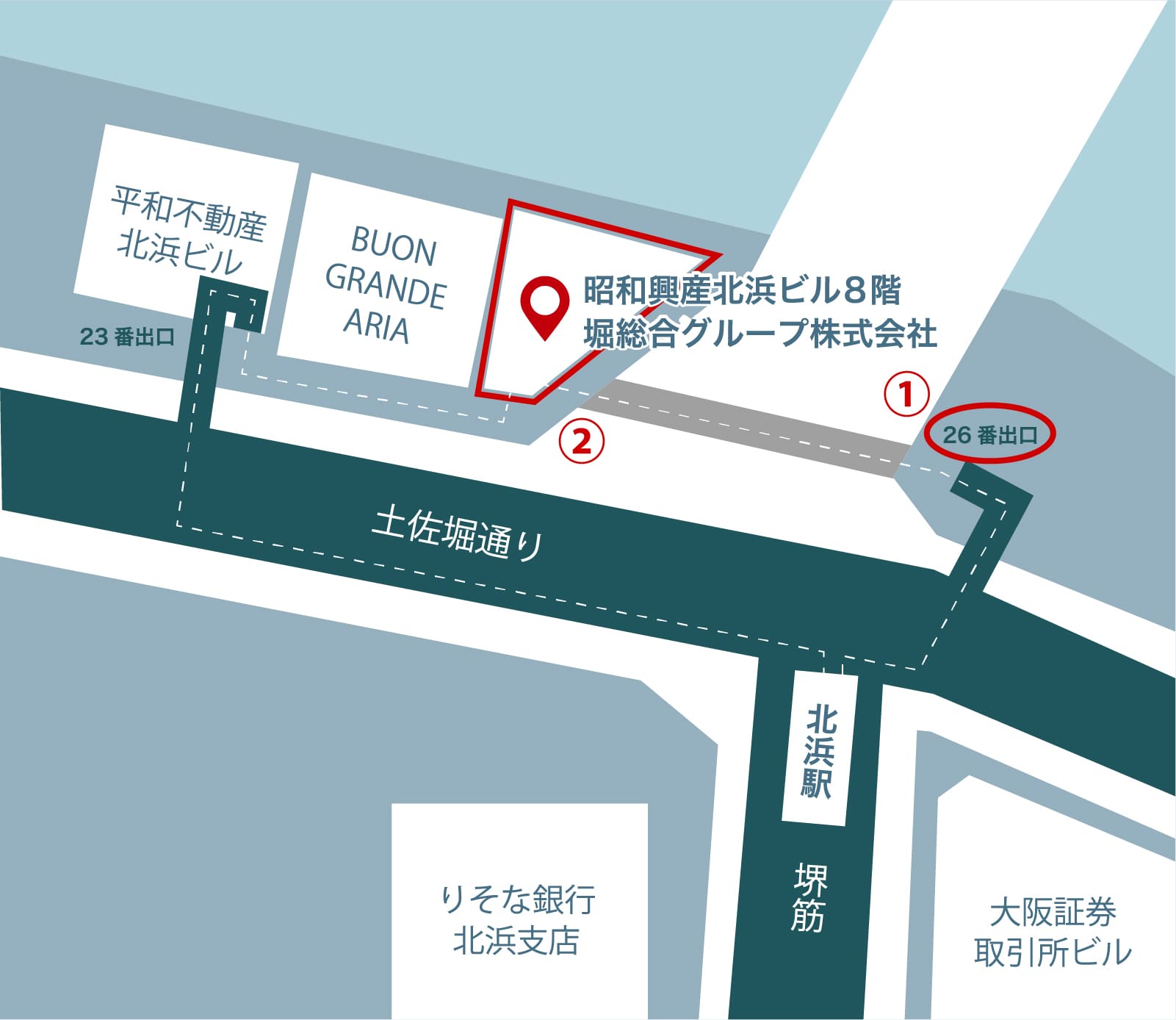 ①京阪電車・地下鉄堺筋線の北浜駅の26番出口が最寄りです。